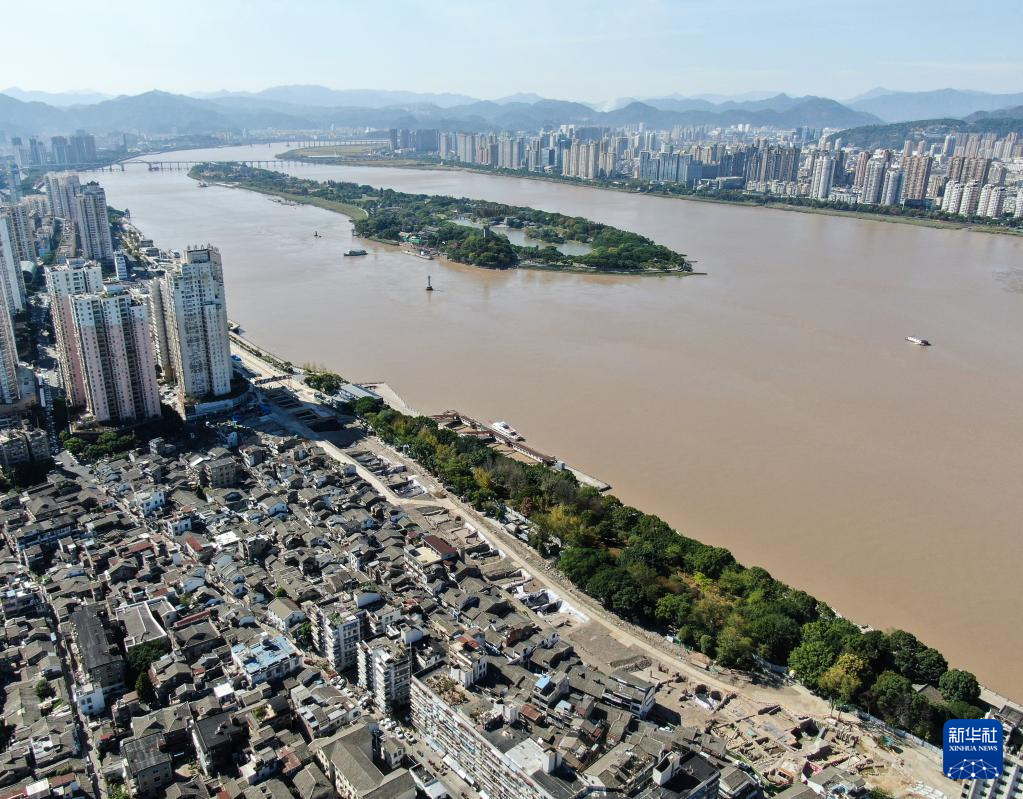 浙江溫州朔門古港考古發掘現場,遠處為甌江上的江心嶼(2022年10月10日攝,無人機照片)。