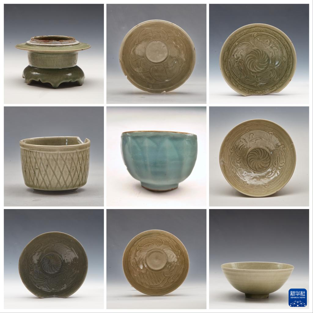 浙江溫州朔門古港遺址發掘出的龍泉窯瓷器(拼版資料照片)。