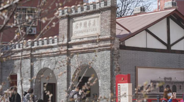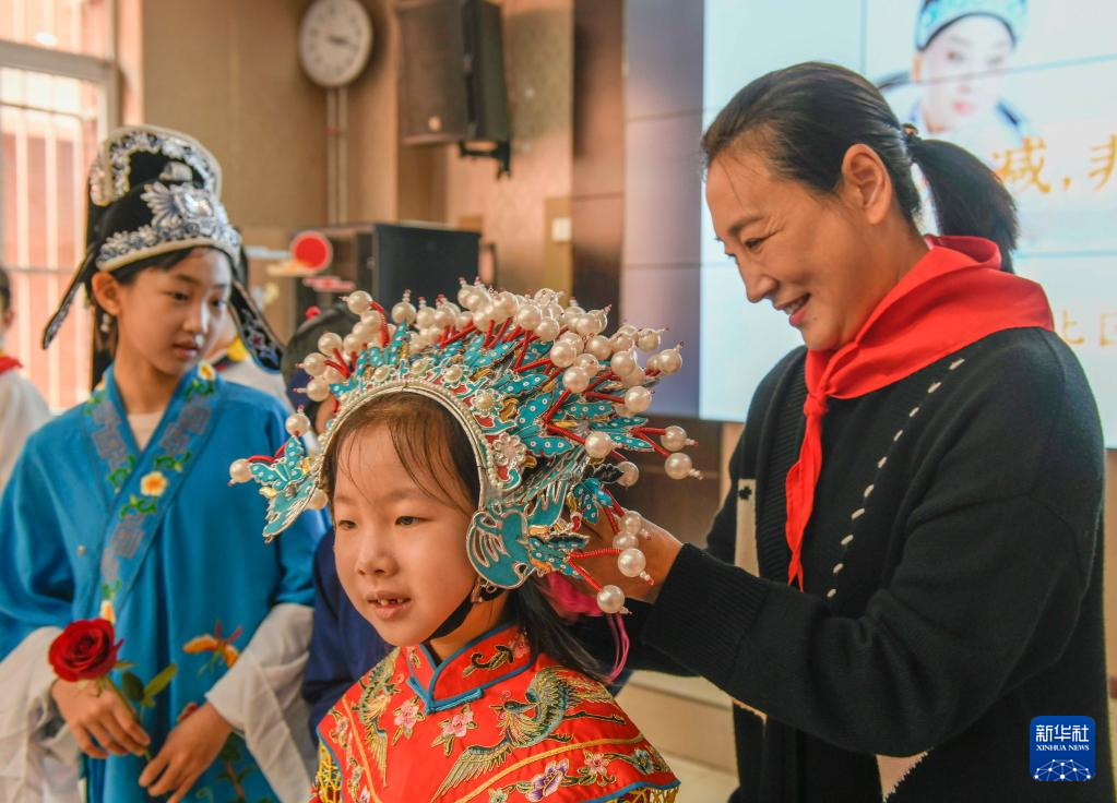 3月28日,戲曲老師在唐山市路北區七十號小學幫助學生整理評劇表演服飾。