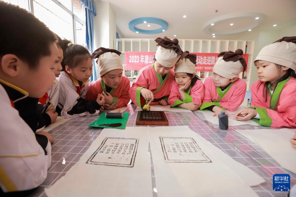 3月28日,唐山市路北區七十號小學學生在體驗活字印刷術。