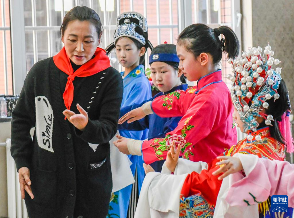 3月28日,戲曲老師在唐山市路北區七十號小學指導學生進行評劇表演。