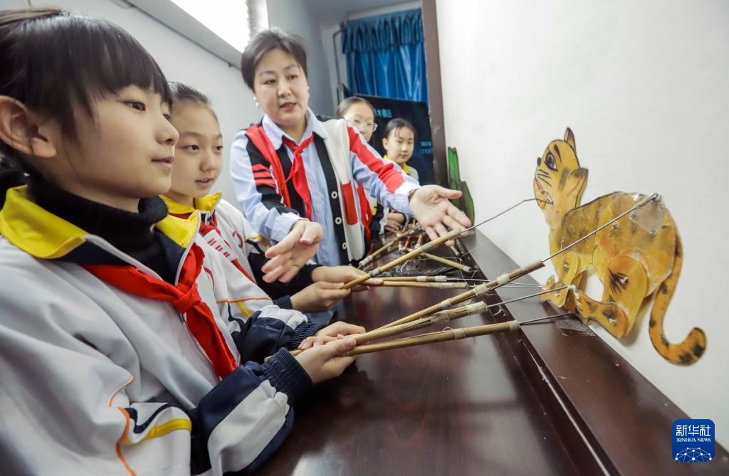 3月28日,皮影戲表演老師在唐山市路北區七十號小學指導學生表演皮影戲。