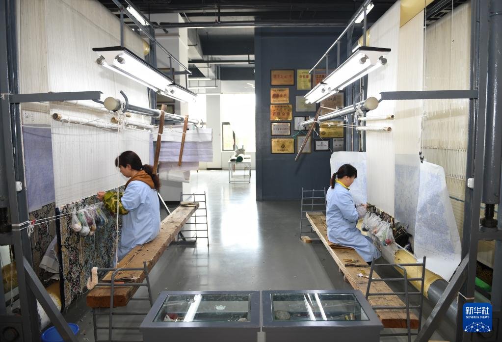 3月21日,四川閬中一家企業工人在編織絲毯。