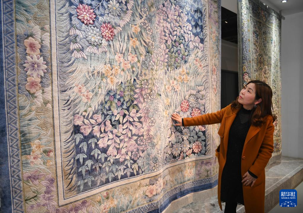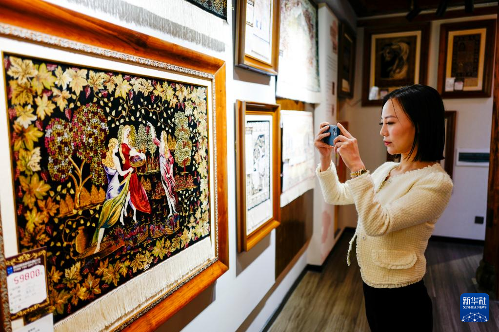 3月21日,游客在銀河絲坊觀賞出口海外的絲毯產品。