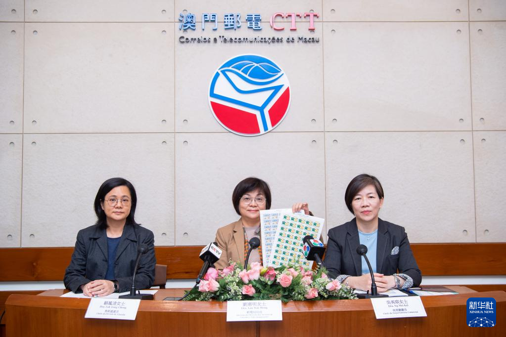 3月30日,澳門郵電局局長劉惠明(中)在新聞發布會上展示“澳門基本法頒布三十周年”郵品。