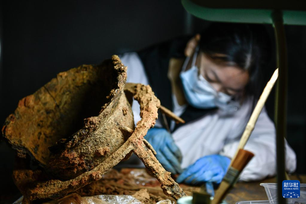 3月30日,在貴州貴安新區大松山墓群文物臨時庫房,文物保護專業的學生在清理出土的鐵器類文物。