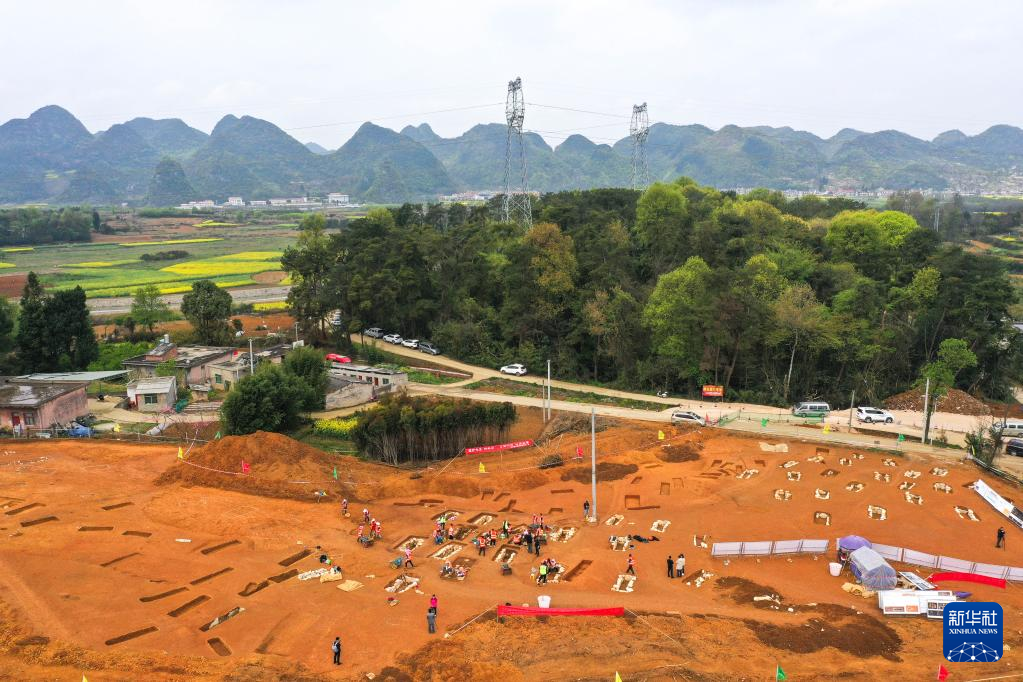 3月30日拍攝的貴州貴安新區大松山墓群挖掘現場(無人機全景照片)。