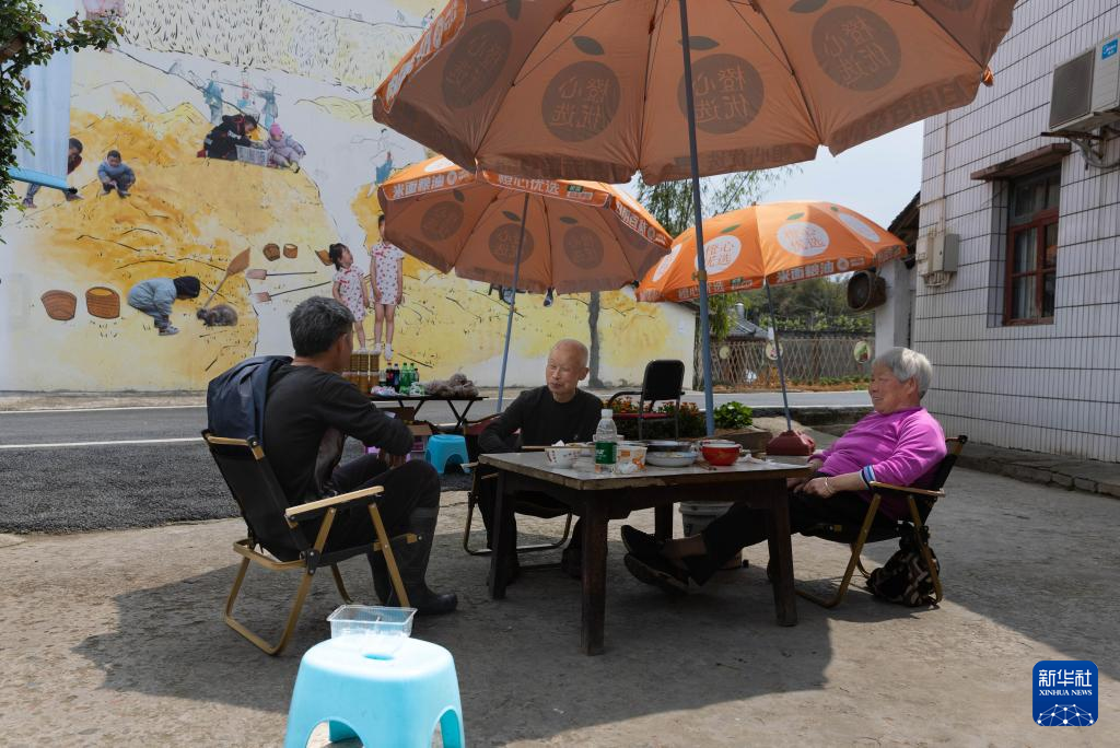 這是在寶勝村村屋墻壁上展出的影像藝術作品(4月1日攝,無人機照片)。