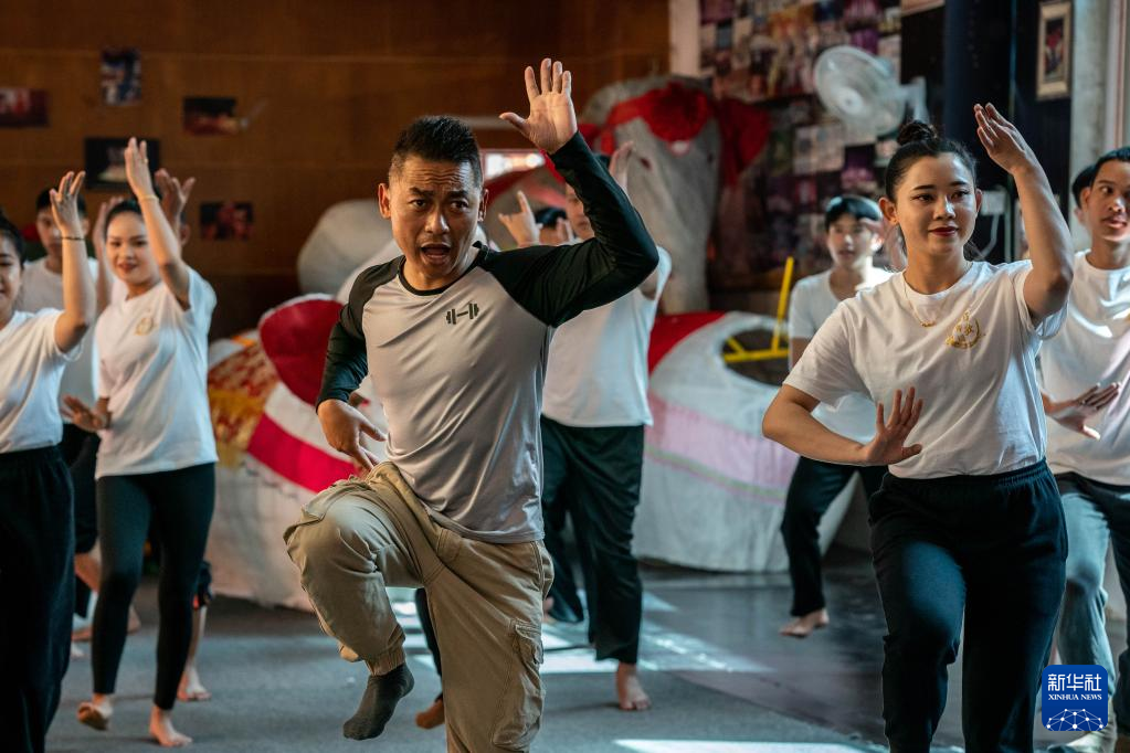 耿馬縣民族歌舞團團長王峰(右下)在和演員們交流舞蹈動作(3月23日攝)。