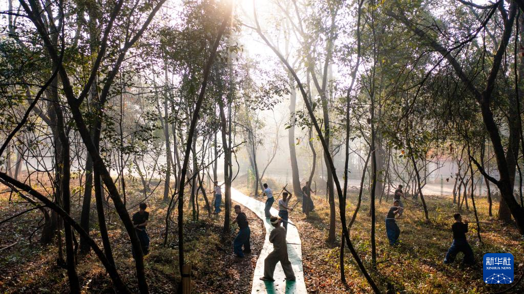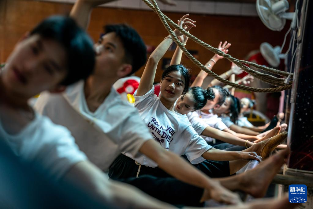 耿馬縣民族歌舞團的演員們在練習刀舞(無人機照片,3月23日攝)。