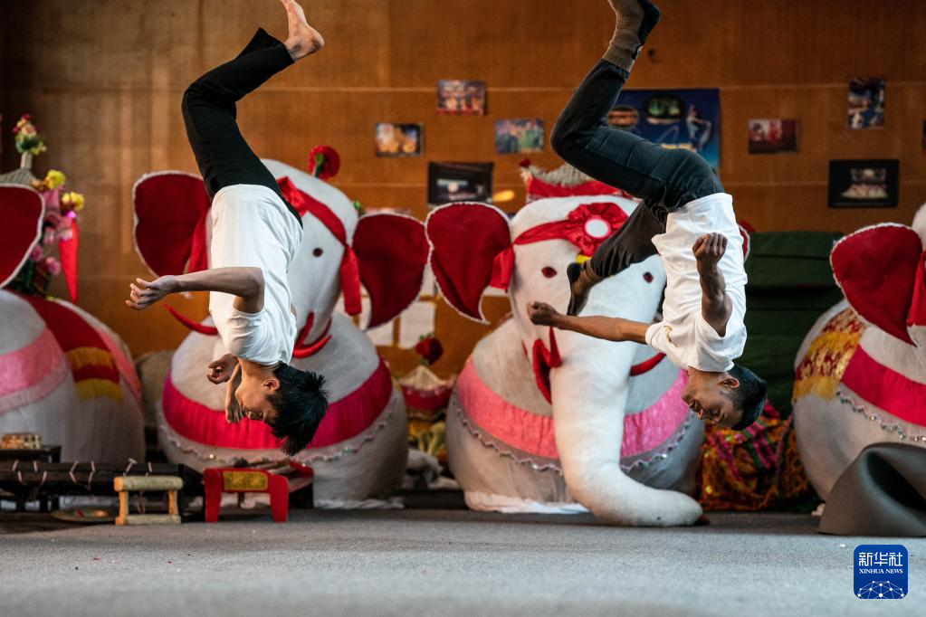 耿馬縣民族歌舞團演員巖平(左)、宰努思在練功房練習側空翻(3月23日攝)。