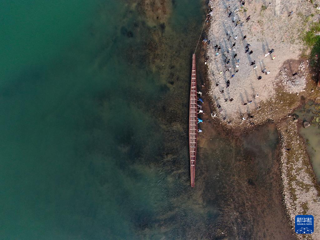 4月1日,景洪市勐罕鎮曼聽村村民推送龍舟進入瀾滄江(無人機照片)。