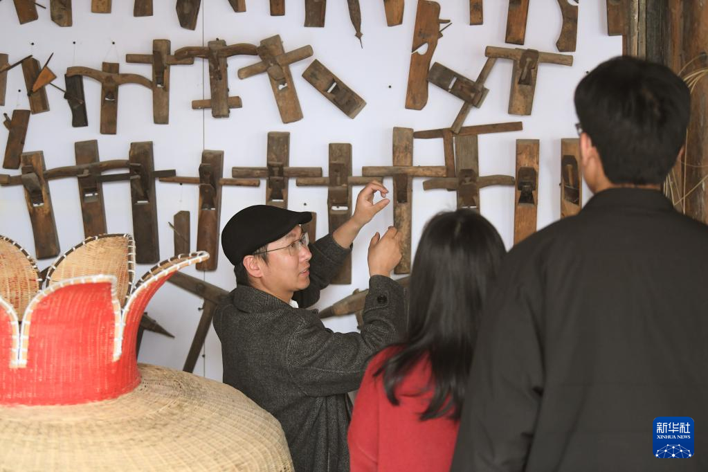 4月3日,姜鵬(左)給游客介紹木工工具。