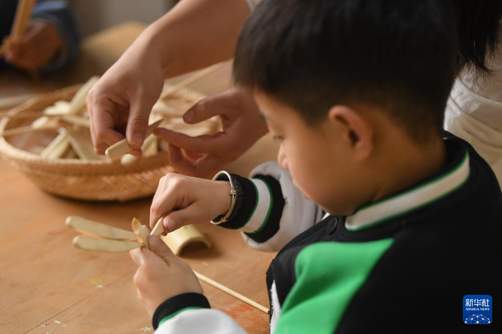 4月3日,姜鵬指導前來研學的小學生制作竹蜻蜓。