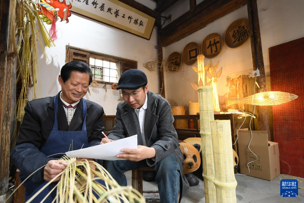4月3日,姜鵬(右)和篾匠徐明光交流產品細節。