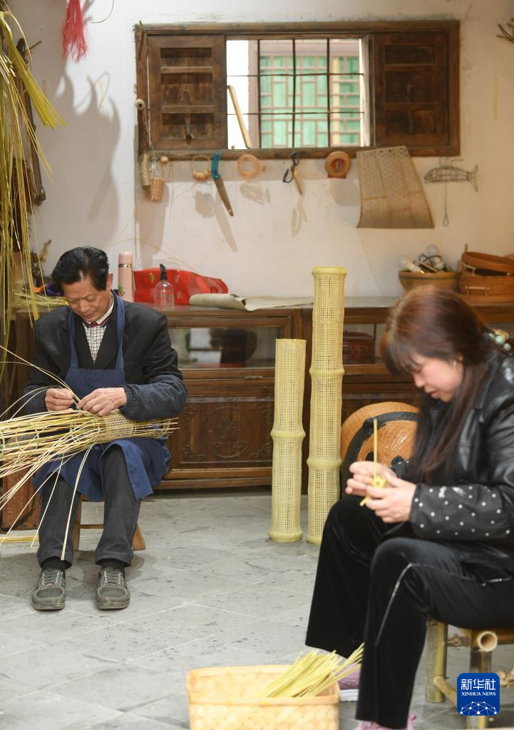 4月3日,村里的篾匠和農戶在姜鵬的工作室里編制竹制品。