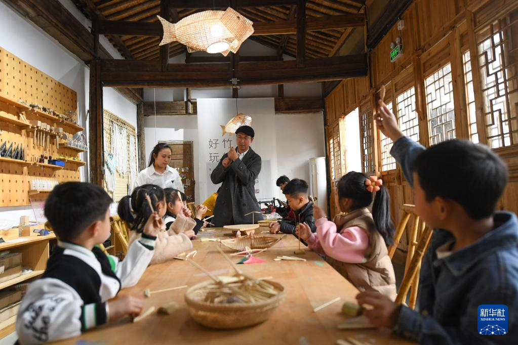 4月3日,前來研學的小學生在姜鵬的工作室制作竹蜻蜓。