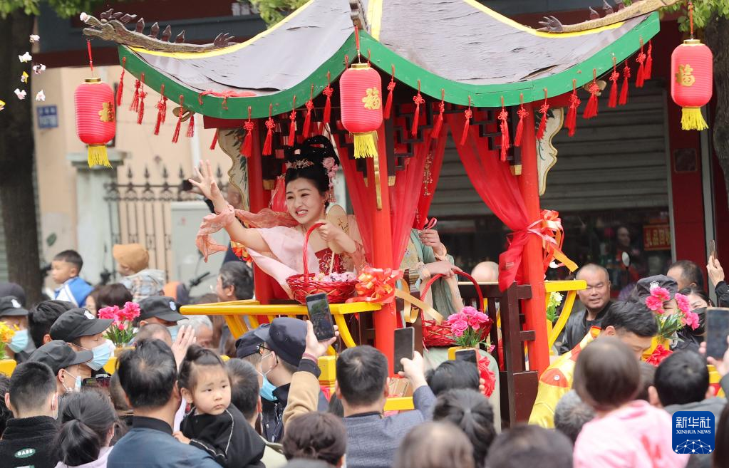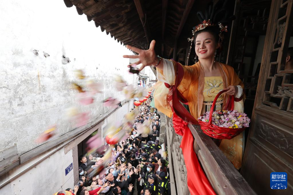 4月5日,在德清縣新市古鎮舉行的蠶花廟會上,“蠶花娘娘”在撒蠶花。