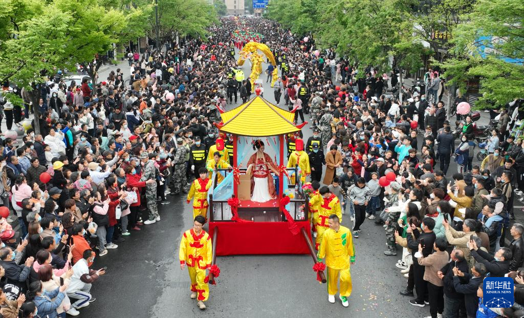 4月5日,在德清縣新市古鎮舉行的蠶花廟會上,人們參加民俗巡游活動(無人機照片)。