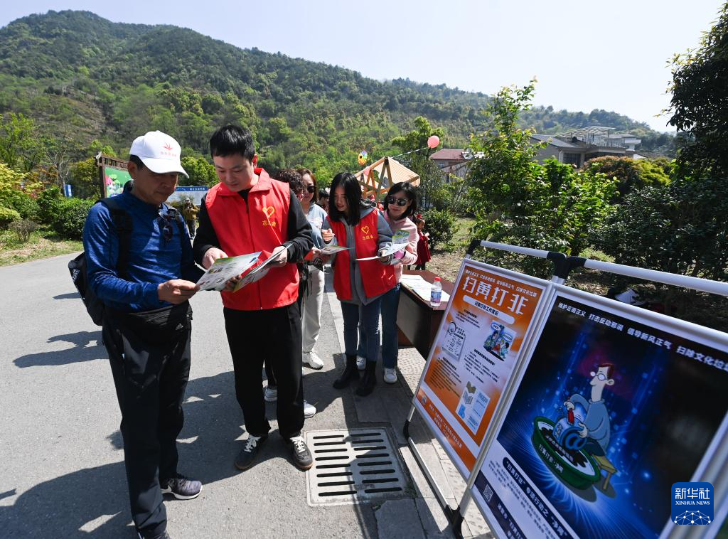 4月8日,諸暨市志愿者在趙家鎮皂溪村發放“掃黃打非”科普知識宣傳冊。