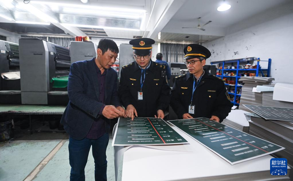 4月7日,諸暨市文化市場行政執法隊的工作人員在檢查印刷企業印刷品內容是否規范。