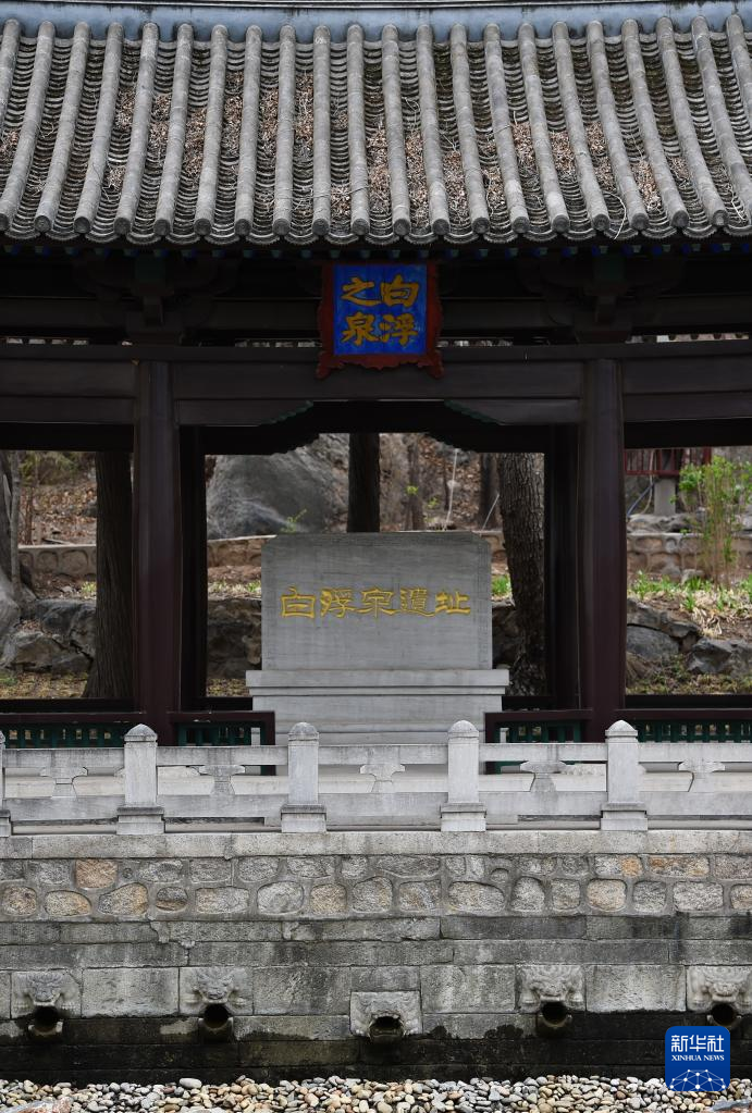 這是4月6日在位于北京市昌平區的大運河源頭遺址公園里拍攝的“白浮之泉”碑亭和九龍池。