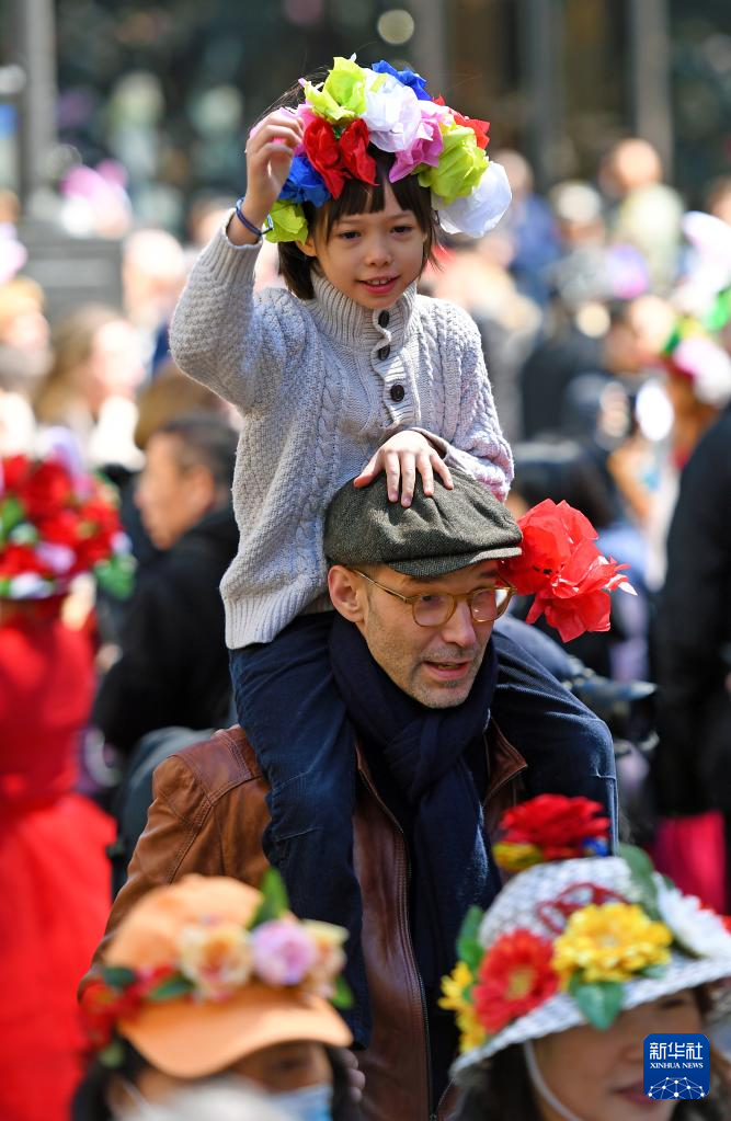 當日是西方傳統節日復活節,人們頭戴精心制作的花帽,在紐約第五大道參加一年一度的復活節游行。