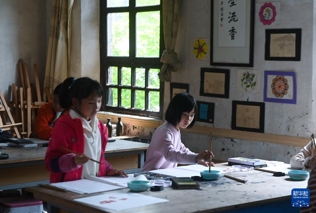 4月12日,諸暨市東白湖鎮斯民小學的學生在上國畫課。