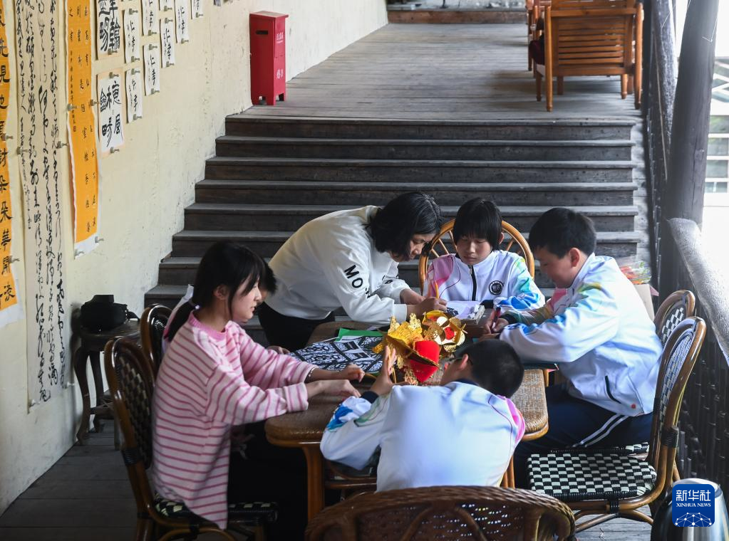 4月12日,諸暨市東白湖鎮斯民小學的學生在上宮燈制作課程。