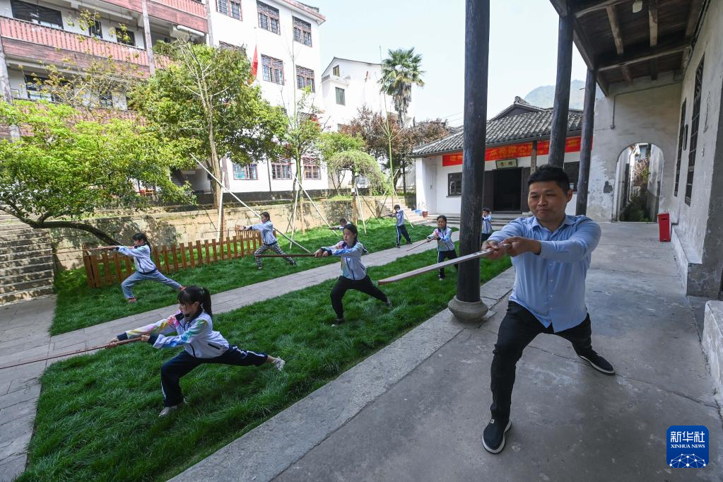 4月12日,諸暨市東白湖鎮斯民小學的學生在學習傳統武術舞劍。