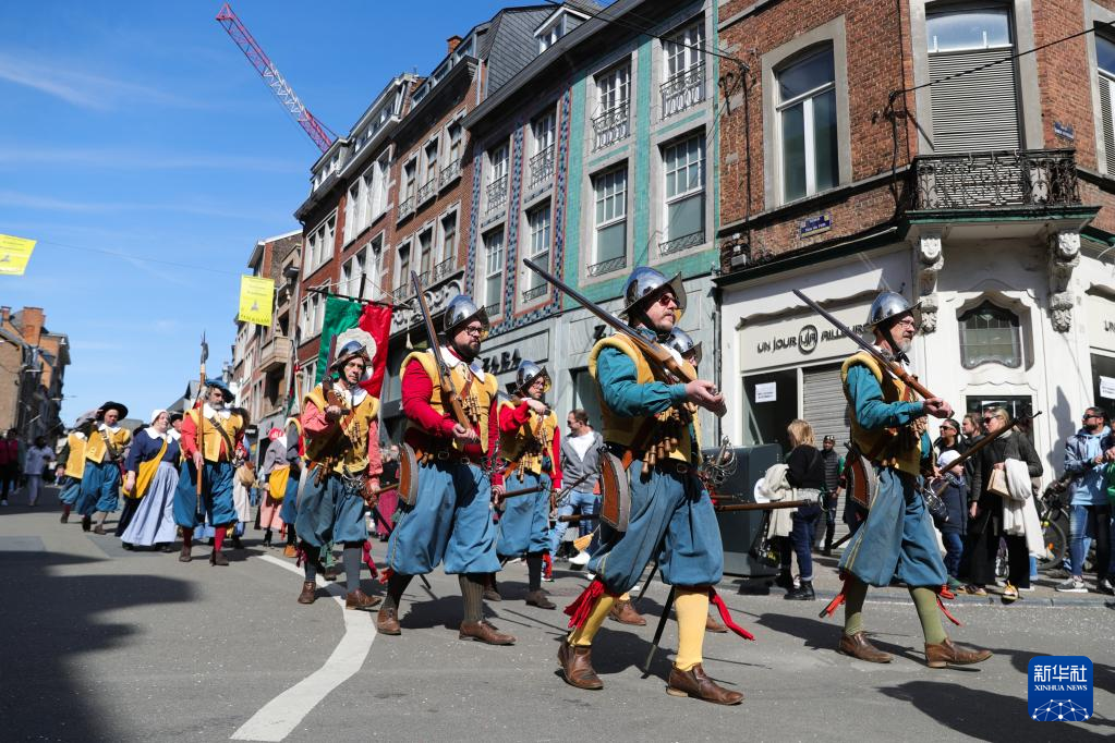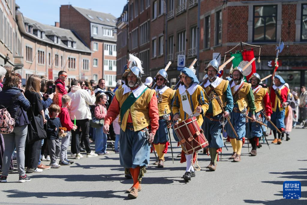 4月15日,身著古裝的游行隊伍在比利時那慕爾市傳統民俗日活動上行進。