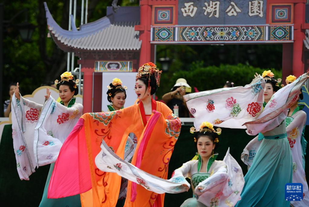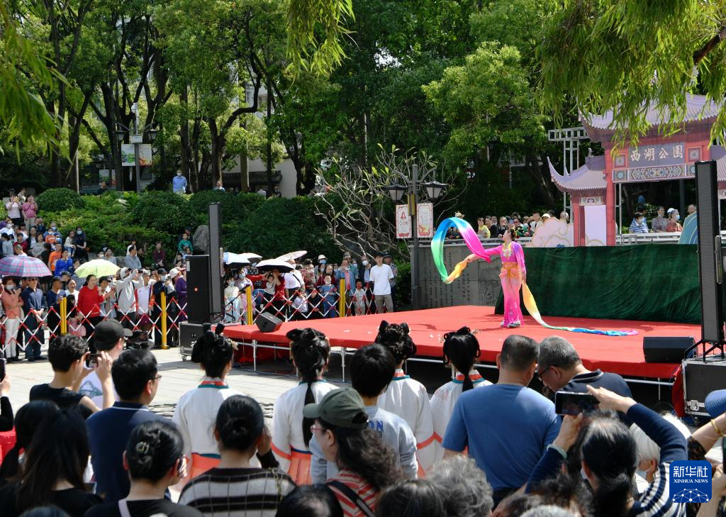 4月15日,在福州西湖上巳節啟動儀式現場,市民游客在觀賞舞蹈《天女散花》。