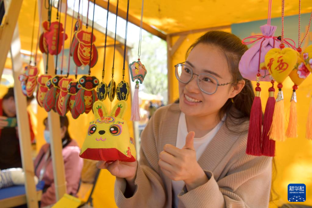 4月18日,非遺傳承人在東營市清風湖黃河大集上介紹絨繡兔。