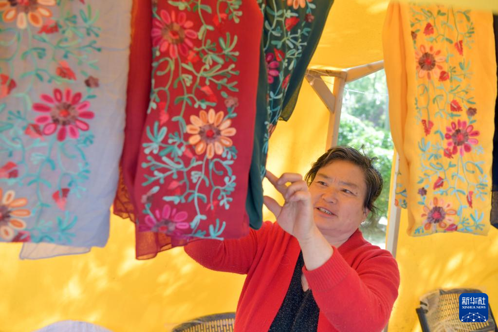 4月18日,非遺傳承人在東營市清風湖黃河大集上介紹刺繡絲巾。
