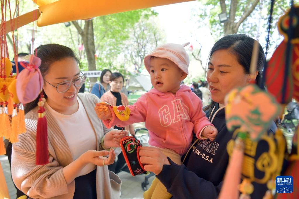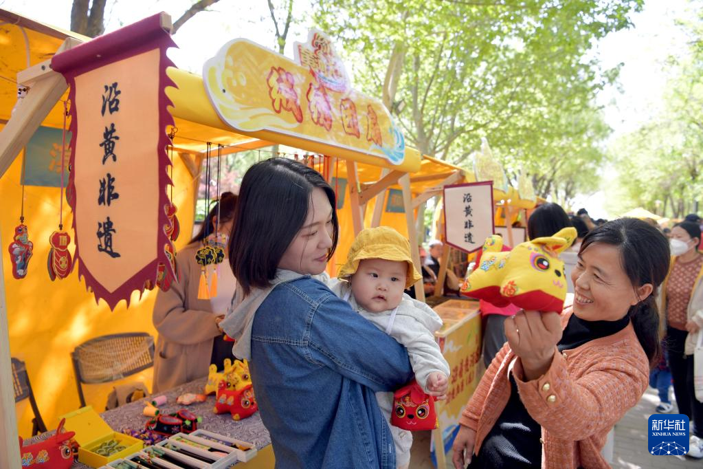 4月18日,市民在東營市清風湖黃河大集上參觀非遺展。