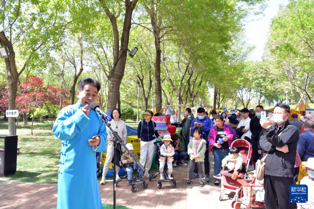 4月18日,文藝工作者在東營市清風湖黃河大集上表演快板。