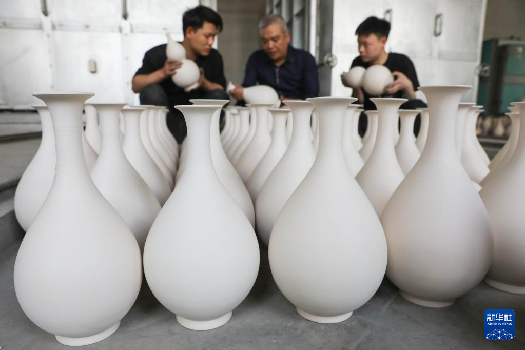 4月19日,在寶豐縣一家汝瓷企業,汝瓷藝人王占穩(中)與同事一起挑選汝瓷素坯。