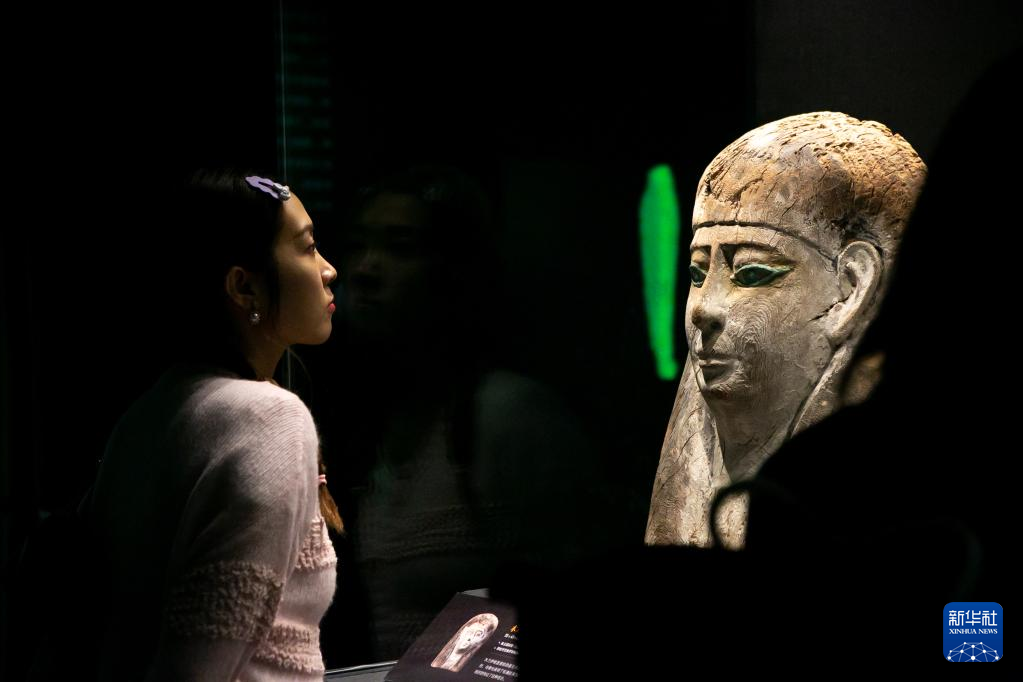 4月20日,觀眾在展覽上觀看木乃伊棺蓋。