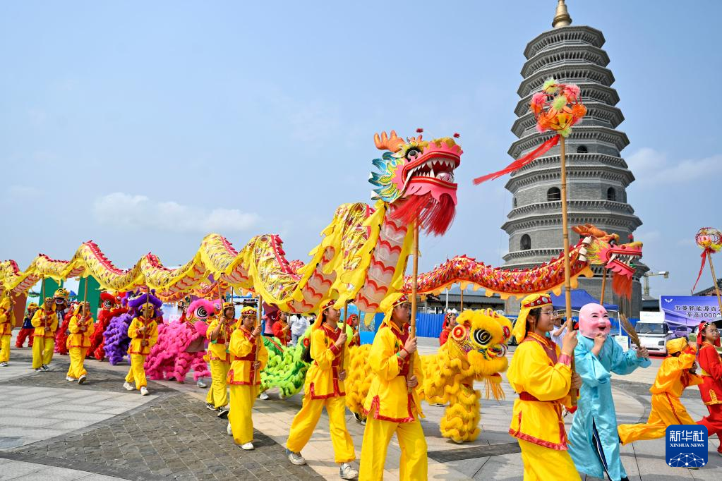 4月20日,在柳城縣鳳山鎮鳳鳴廣場,孩子們參加舞龍展演活動。