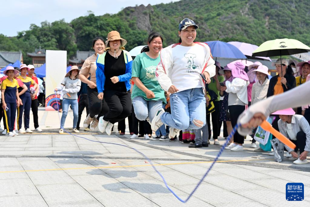 4月20日,在柳城縣鳳山鎮鳳鳴廣場,村民在跳繩。