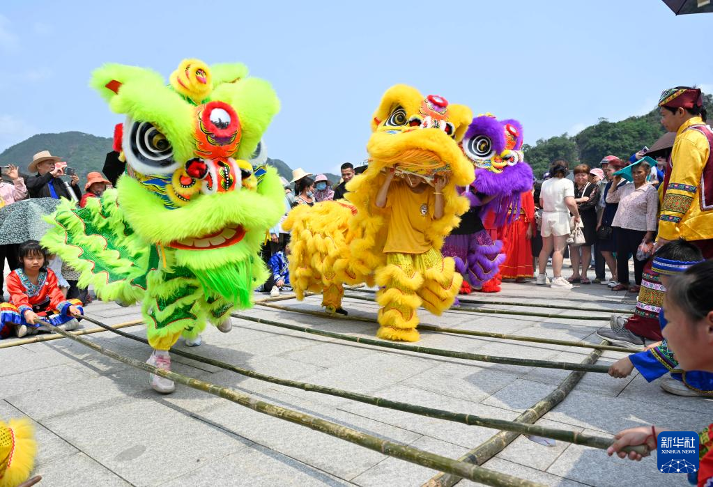 4月20日,在柳城縣鳳山鎮鳳鳴廣場,舞獅藝人在跳竹竿舞。