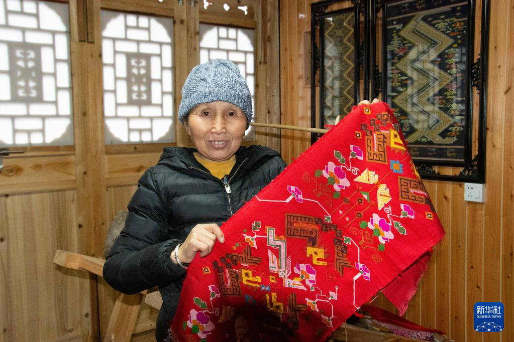 2022年1月7日,土家織錦國家級非遺傳承人劉代娥在湖南省龍山縣苗兒灘鎮撈車村展示自己做的土家織錦。新華社記者 柳王敏 攝