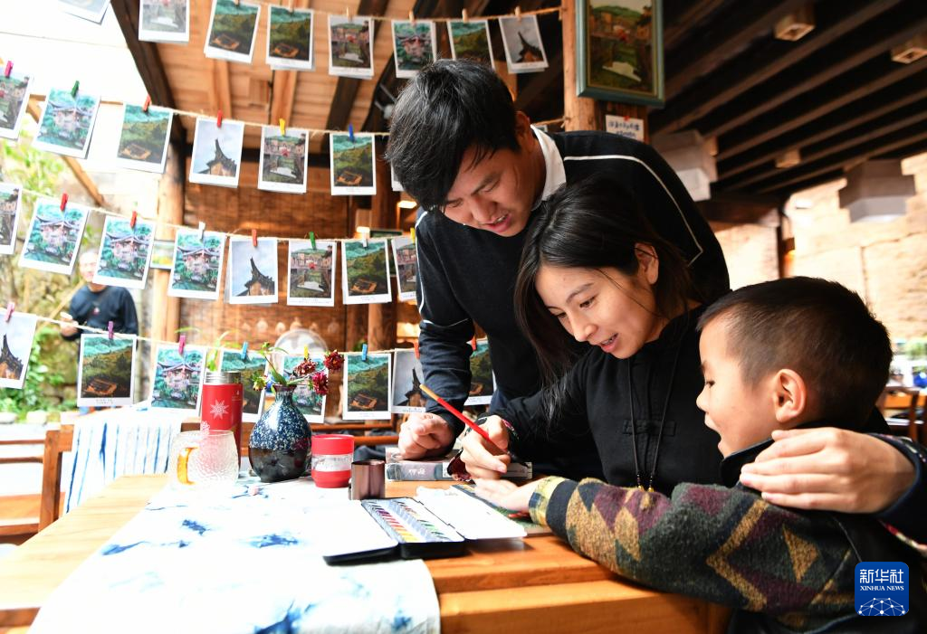 來自江西省吉安市的胡文亮是福建省寧德市屏南縣龍潭村引進的文創和專業設計人才。2020年5月,他投資六十多萬元翻新改造的兼具酒館、民宿和陶藝等功能的文創空間正式開業?!笆弧秉S金周期間接待游客近800人次。這是胡文亮(左一)和愛人曾婉珍(中)、小孩一起在繪制龍潭村主題明信片(2020年10月21日攝)。新華社記者 魏培全 攝