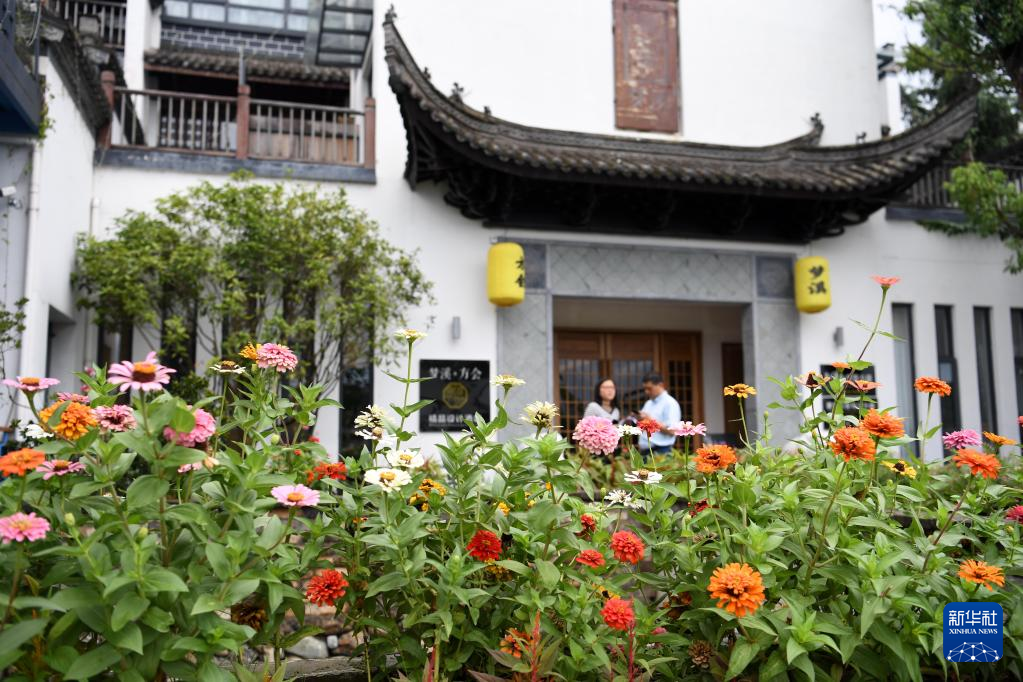 2019年8月29日,游客在安徽省黃山市徽州區西溪南鎮西溪南村的民宿外駐足。新華社記者 劉軍喜 攝