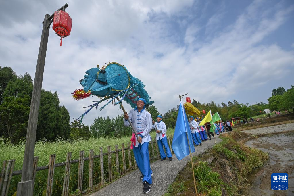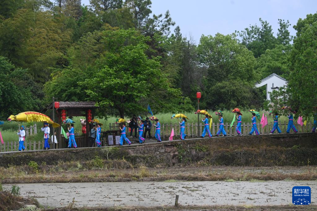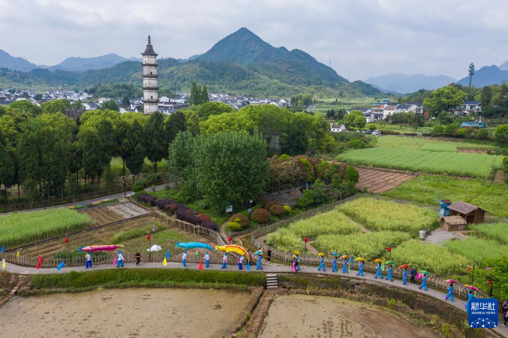 4月21日,“嚴州蝦燈”展演隊伍行走在建德市大慈巖鎮新葉古村的田野中。