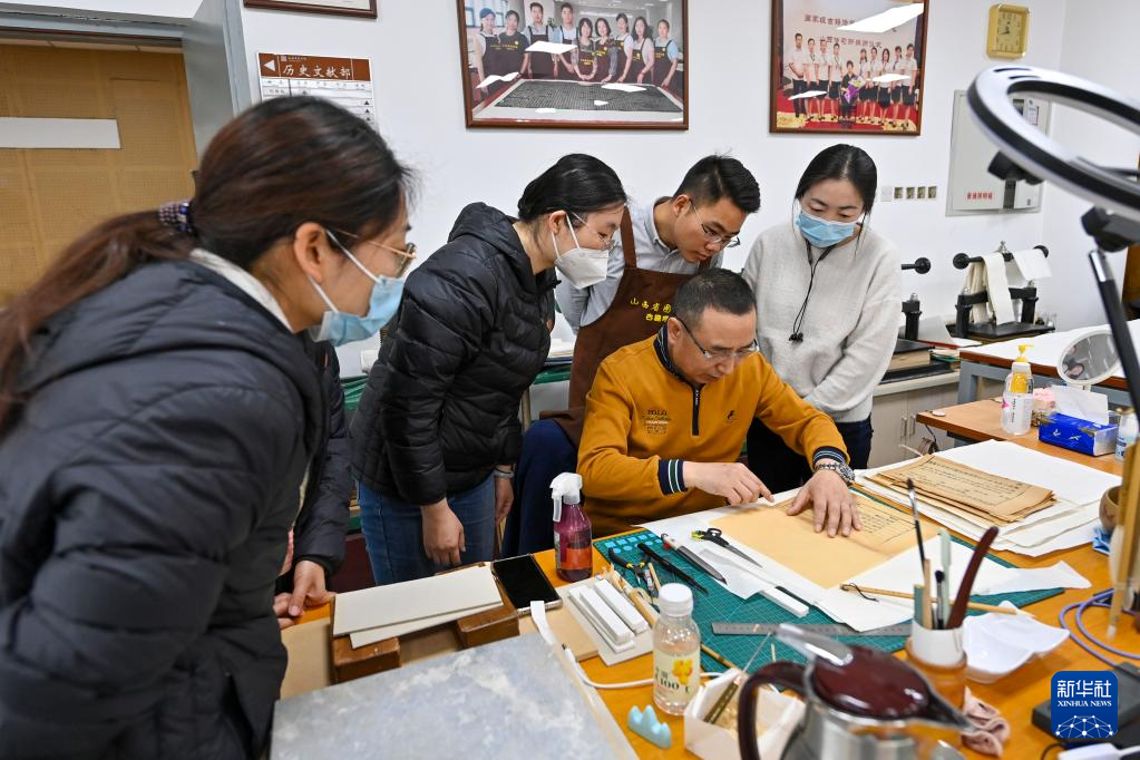 在山西省圖書館古籍修復中心,修復導師劉建明(右二)向古籍修復師們講解古籍修復細節(4月21日攝)。