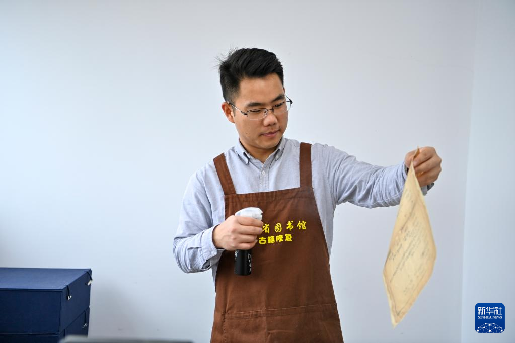 在山西省圖書館古籍修復中心,程文濤為古籍噴水準備修復(4月21日攝)。