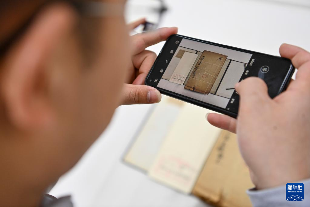 在山西省圖書館古籍修復中心,程文濤拍照記錄古籍原始信息(4月21日攝)。