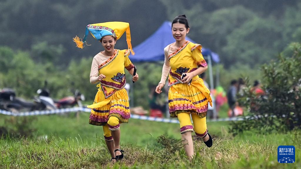 4月22日,在欽北區貴臺鎮洞利江河畔,兩名少女在趕赴實景演出現場。