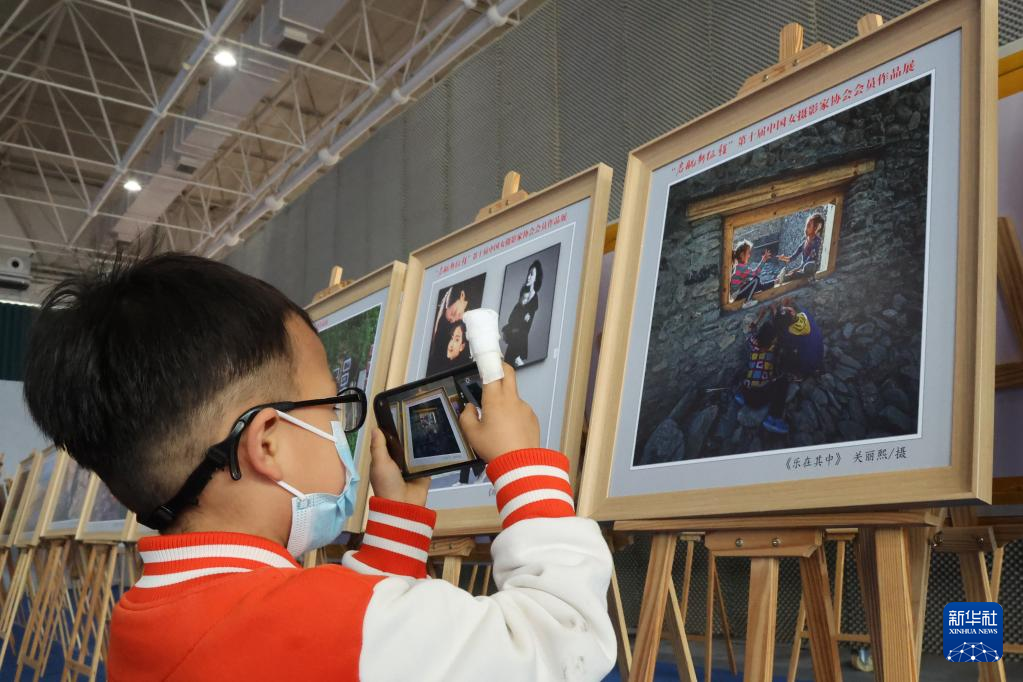 4月23日,小朋友在展覽現場拍攝展出的攝影作品。